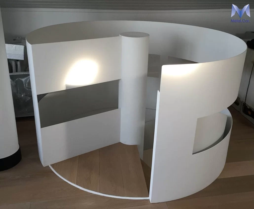 Questo complemento d’arredo, avvolto da lamiere curve, con pedate in legno sorrette da un pilastro centrale sono la perfetta sintesi fra design moderno ed essenzialità.